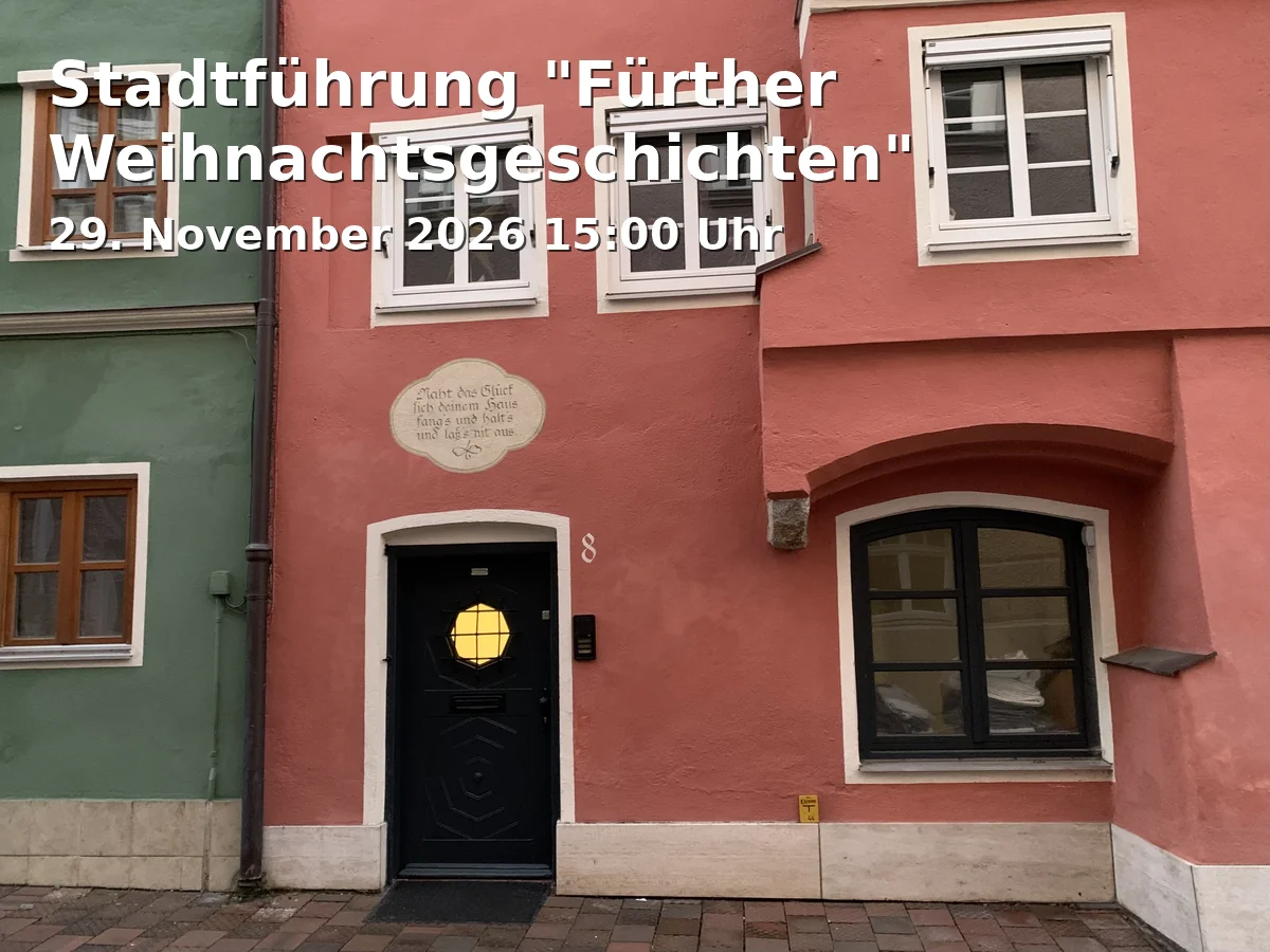 This city tour takes you into Fürth during the Advent season and lovingly combines beautifully told Christmas stories with Franconian customs and the special flair of the festively decorated old town. The walk starts at the Town Hall, entrance Königstraße 88, lasts 60 minutes, and takes place on 29.11.2026 at 15:00. The regular price is 10.00 Euros, reduced price is 8.00 Euros. The tour is suitable for people with mobility impairments; pre-registration is not necessary. ([tourismus-fuerth.de](https://www.tourismus-fuerth.de/erleben-geniessen/stadtspaziergaenge/fuerth-classics/weihnachtsgeschichten?utm_source=openai))
