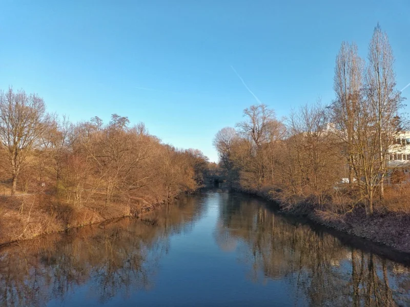 A fast and wide connection across the Pegnitz River connects the European long-distance cycle route in the floodplains with the riverside town and the eastern part of the city. At low water levels, features in the riverbed serving various water management purposes are also visible. Coming from the Broadcasting Museum, cyclists can reach higher speeds up to the junction with the European long-distance cycle route, provided they aren't slowed down by cars crossing from the riverside town's parking lot or by a group of kindergarten children. The footbridge is wide enough that individual pedestrians or cyclists don't cause any need to brake. However, children shouldn't cycle at high speeds here, as they cannot yet adequately judge speed and the dangers of crossing and oncoming traffic.