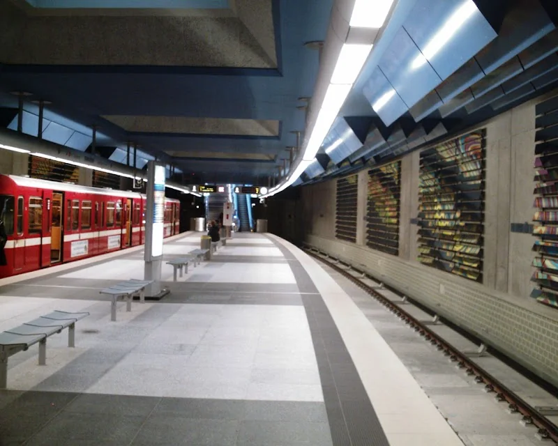 Schöner Bahnhof. Das Besondere sind die Spiegel, die viele bunte Punkte zeigen. Geschäfte und die Bushaltestelle befinden sich an der Oberfläche.