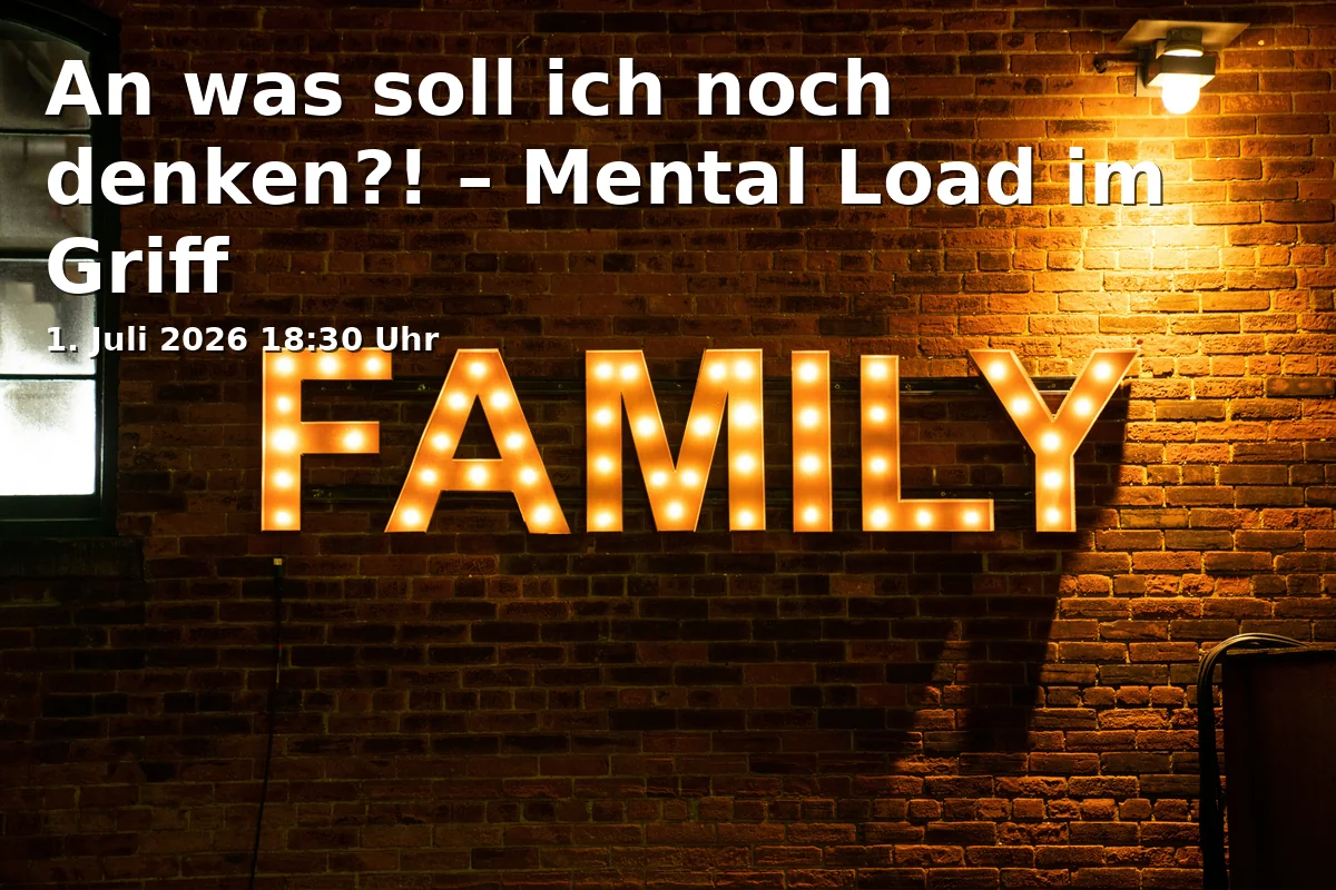 Der Alltag von Familien steckt voller Termine, Listen und spontaner Aufgaben. Genau dort setzt der Vortrag An was soll ich noch denken?! – wie Sie Ihren Mental Load in den Griff kriegen – statt umgekehrt an: Er zeigt, warum mentale Überlastung so häufig entsteht und welche Wege zu mehr Leichtigkeit im Familienleben führen können.