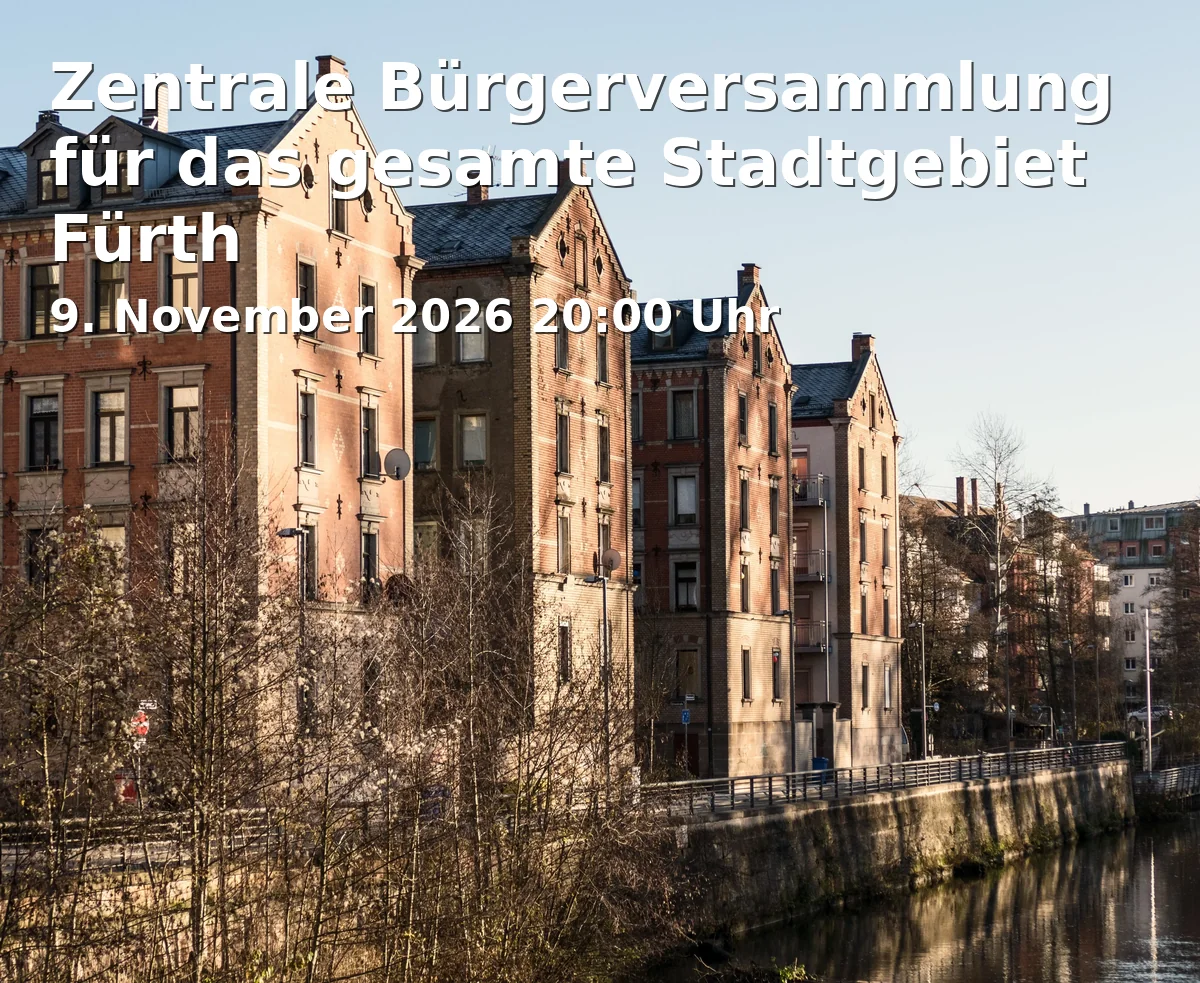 Am Montag, 9. November 2026, öffnet die Stadthalle Fürth ihre Türen für die zentrale Bürgerversammlung des gesamten Stadtgebiets. Hier stehen Fragen von allgemeinem öffentlichem Interesse im Mittelpunkt – ein Abend für alle Gemeindebürgerinnen und -bürger, die ihre Themen direkt einbringen möchten. Die Stadthalle gilt als zentraler Veranstaltungsort mit 2.500 m² Fläche, moderner Technik und barrierearmen Zugängen; der Einlass erfolgt in der Regel etwa eine Stunde vor Beginn. ([stadthalle-fuerth.de](https://www.stadthalle-fuerth.de/))